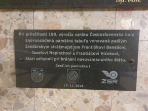 Z iniciatívy známeho dramatika a člena trnavského Národného výboru Ferka Urbánka bola  na železničnej stanici v Trnave umiestnená 17. septembra 1922 pamätná tabuľa pripomínajúca smrť troch četníkov (Beneša, Neplechu a Vlčeka) pri obrane vzniku Československa v novembri 1918.  Pôvodná tabuľa bola po vybudovaní novej stanice odložená do depozitu.  V roku 2018 po jej zreštaurovaní  bola znova osadená v podchode novej železničnej stanice.